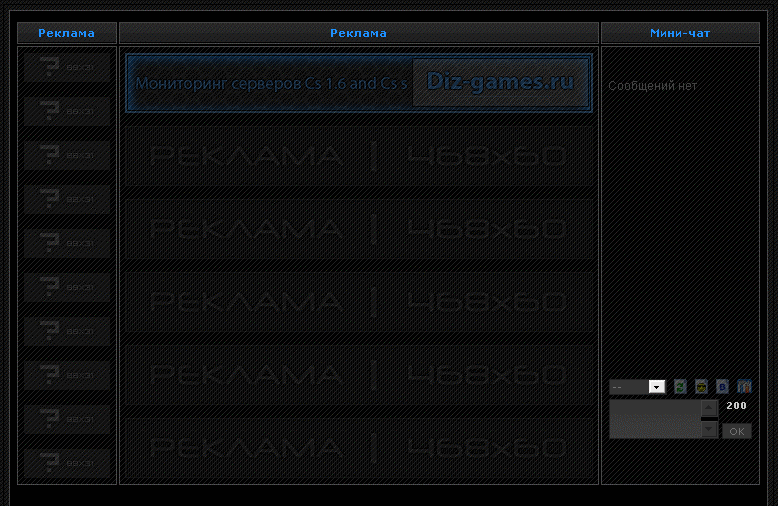 <table width="100%" cellpadding="0" cellspacing="0"><tbody><tr><td><table width="100%" align="center" cellpadding="0" cellspacing="2"><tbody><tr><td rowspan="1" style="border: 1px solid rgb(73, 73, 73); background: rgb(0, 0, 0) url(http://diz-games.ru/img/9.gif) repeat scroll 0% 50%; -moz-background-clip: border; -moz-background-origin: padding; -moz-background-inline-policy: continuous; color: rgb(130, 130, 130); height: 22px; font-size: 10px;" align="center"><span style="font-size: 8pt;"><b><span style="color: rgb(30, 144, 255); font-size: 8pt;">Реклама</span></b></span></td><td style="border: 1px solid rgb(73, 73, 73); background: rgb(0, 0, 0) url(http://diz-games.ru/img/9.gif) repeat scroll 0% 50%; -moz-background-clip: border; -moz-background-origin: padding; -moz-background-inline-policy: continuous; color: rgb(130, 130, 130); height: 22px; font-size: 10px;" align="center"><b><span style="color: rgb(30, 144, 255);"><span style="font-size: 8pt;">Реклама</span><br></span></b></td><td rowspan="1" style="border: 1px solid rgb(73, 73, 73); background: rgb(0, 0, 0) url(http://diz-games.ru/img/9.gif) repeat scroll 0% 50%; -moz-background-clip: border; -moz-background-origin: padding; -moz-background-inline-policy: continuous; color: rgb(130, 130, 130); height: 22px; font-size: 10px;" align="center"><span style="font-size: 8pt;"><b><span style="color: rgb(30, 144, 255); font-size: 8pt;">Мини-чат</span></b></span></td></tr><tr><td rowspan="1" style="border: 1px solid rgb(72, 72, 72); padding: 5px; background: black url(http://sinners.pp.ua/img/1.gif) repeat scroll 0% 50%; -moz-background-clip: border; -moz-background-origin: padding; -moz-background-inline-policy: continuous;" align="center"><span style="color: rgb(255, 255, 255);"></span><span style="color: rgb(255, 255, 255);"><div id="banners"><a href="http://diz-games.ru/forum/99" target="_blank" title=" реклама на diz-games.ru"><img src="http://diz-games.ru/6anerbl/Obmen1.gif" width="88" height="31" border="0" /></a><br><br><a href="http://diz-games.ru/forum/99" target="_blank" title=" реклама на diz-games.ru"><img src="http://diz-games.ru/6anerbl/Obmen1.gif" width="88" height="31" border="0" /></a><br><br><a href="http://diz-games.ru/forum/99" target="_blank" title=" реклама на diz-games.ru"><img src="http://diz-games.ru/6anerbl/Obmen1.gif" width="88" height="31" border="0" /></a><br><br><a href="http://diz-games.ru/forum/99" target="_blank" title=" реклама на diz-games.ru"><img src="http://diz-games.ru/6anerbl/Obmen1.gif" width="88" height="31" border="0" /></a><br><br><a href="http://diz-games.ru/forum/99" target="_blank" title=" реклама на diz-games.ru"><img src="http://diz-games.ru/6anerbl/Obmen1.gif" width="88" height="31" border="0" /></a><br><br><a href="http://diz-games.ru/forum/99" target="_blank" title=" реклама на diz-games.ru"><img src="http://diz-games.ru/6anerbl/Obmen1.gif" width="88" height="31" border="0" /></a><br><br><a href="http://diz-games.ru/forum/99" target="_blank" title=" реклама на diz-games.ru"><img src="http://diz-games.ru/6anerbl/Obmen1.gif" width="88" height="31" border="0" /></a><br><br><a href="http://diz-games.ru/forum/99" target="_blank" title=" реклама на diz-games.ru"><img src="http://diz-games.ru/6anerbl/Obmen1.gif" width="88" height="31" border="0" /></a><br><br><a href="http://diz-games.ru/forum/99" target="_blank" title=" реклама на diz-games.ru"><img src="http://diz-games.ru/6anerbl/Obmen1.gif" width="88" height="31" border="0" /></a><br><br><a href="http://diz-games.ru/forum/99" target="_blank" title=" реклама на diz-games.ru"><img src="http://diz-games.ru/6anerbl/Obmen1.gif" width="88" height="31" border="0" /></a><br></div></span></td><td style="border: 1px solid rgb(72, 72, 72); padding: 5px; background: black url(http://sinners.pp.ua/img/1.gif) repeat scroll 0% 50%; -moz-background-clip: border; -moz-background-origin: padding; -moz-background-inline-policy: continuous;" align="center"><div id="banners"><a href="http://diz-games.ru/index/0-52" target="_blank" title="мониторенг серверов Cs 1.6 and Cs s"><img src="http://diz-games.ru/6anerbl/m.gif" width="468" height="60" border="0" /></a><br><br><a href="http://diz-games.ru/forum/99" target="_blank" title=" реклама на diz-games.ru"><img src="http://diz-games.ru/468x60.png" width="468" height="60" border="0" /></a><br><br><a href="http://diz-games.ru/forum/99" target="_blank" title=" реклама на diz-games.ru"><img src="http://diz-games.ru/468x60.png" width="468" height="60" border="0" /></a><br><br><a href="http://diz-games.ru/forum/99" target="_blank" title=" реклама на diz-games.ru"><img src="http://diz-games.ru/468x60.png" width="468" height="60" border="0" /></a><br><br><a href="http://diz-games.ru/forum/99" target="_blank" title=" реклама на diz-games.ru"><img src="http://diz-games.ru/468x60.png" width="468" height="60" border="0" /></a><br><br><a href="http://diz-games.ru/forum/99" target="_blank" title=" реклама на diz-games.ru"><img src="http://diz-games.ru/468x60.png" width="468" height="60" border="0" /></a><br></div></td><td rowspan="1" style="border: 1px solid rgb(72, 72, 72); padding: 5px; background: black url(http://sinners.pp.ua/img/1.gif) repeat scroll 0% 50%; -moz-background-clip: border; -moz-background-origin: padding; -moz-background-inline-policy: continuous;" align="center"><div id="banners">$CHAT_BOX$<br></div></td></tr></tbody></table>